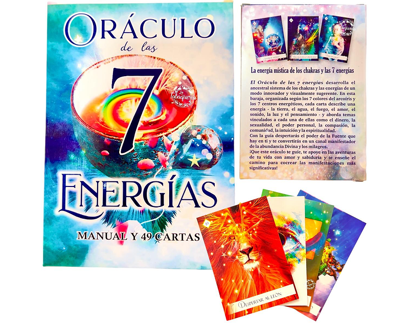 Estas cartas oraculares, Desarrollan el ancestral sistema de los chakras y las energías de un modo innovador y visualmente sugerente. En esta baraja, organizada según los 7 colores del arcoíris y los 7 centros energéticos, cada carta describe una energía la tierra, el agua, el fuego, el amor, el sonido, la luz y el pensamiento y aborda temas vinculados a cada una de ellas, como el dinero, la sexualidad, el poder personal, la compasión, la comunicación, la intuición y la espiritualidad.