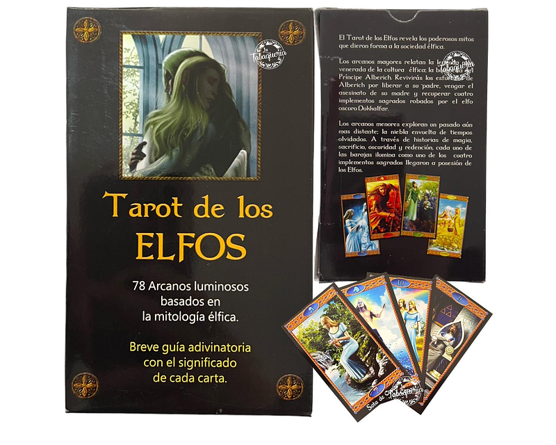 Este Tarot revela los poderosos mitos que dieron forma a la sociedad elfica. Los arcanos mayores relatan la leyenda mas venerada de la cultura élfica: la búsqueda del Principe Alberich. Revivirás los esfuerzos de Alberich por liberar a su padre, vengar el asesinato de su madre y recuperar cuatro implementos sagrados robados por el elfo oscuro Dokkalfar.'Los arcanos menores exploran un pasado aún mas distante; la niebla envuelta de tiempos ólvidados. A través de historias de magia. sacrificio, oscuridad y redención, cada uno de las barajas ilumina como uno de los cuatro implementos sagrados llegaron a posesión de los Elfos.