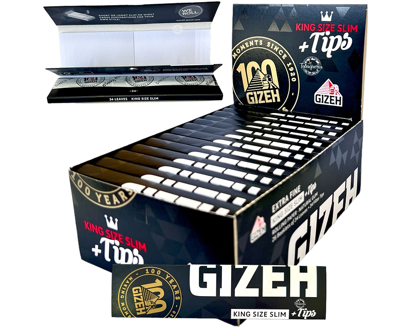 La gama GIZEH BLACK® es sinónimo de calidad y placer en su máxima expresión. Nuestras puntas GIZEH BLACK King Size Slim Extra Fine, contienen 34 papeles extrafinos y 34 puntas de filtro preperforadas para puntas de filtro largas o cortas. Los papeles de liar extrafinos, casi transparentes, con un gramaje de 14 g/m², tienen una tira de goma arábiga natural, la savia de la acacia. Este papel con marca de agua garantiza un disfrute puro y sin adulteraciones. Arde muy lentamente y se apaga si no se fuma el rollito. Los papeles y Tips se presentan en un práctico y sólido folleto con cierre magnético.