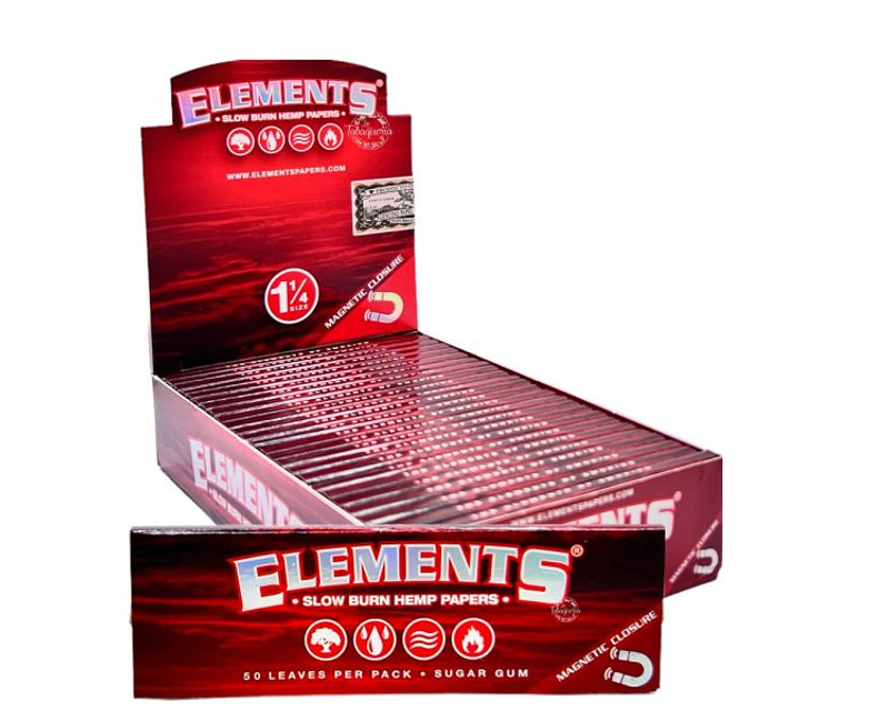 El papel Elements Rojo 1 ¼, es un papel de cáñamo y de combustión lenta, cada papel tiene una marca de agua con impresión patentada, esta marca de agua especial ayuda a prevenir las corridas y mantiene la quemadura más suave. Los papeles elements se caracterizan por describrse de los 4 elementos crecido en la tierra, nutrido por el agua, impulsado por el viento y quemado por el fuego. Papel de Alta Calidad.